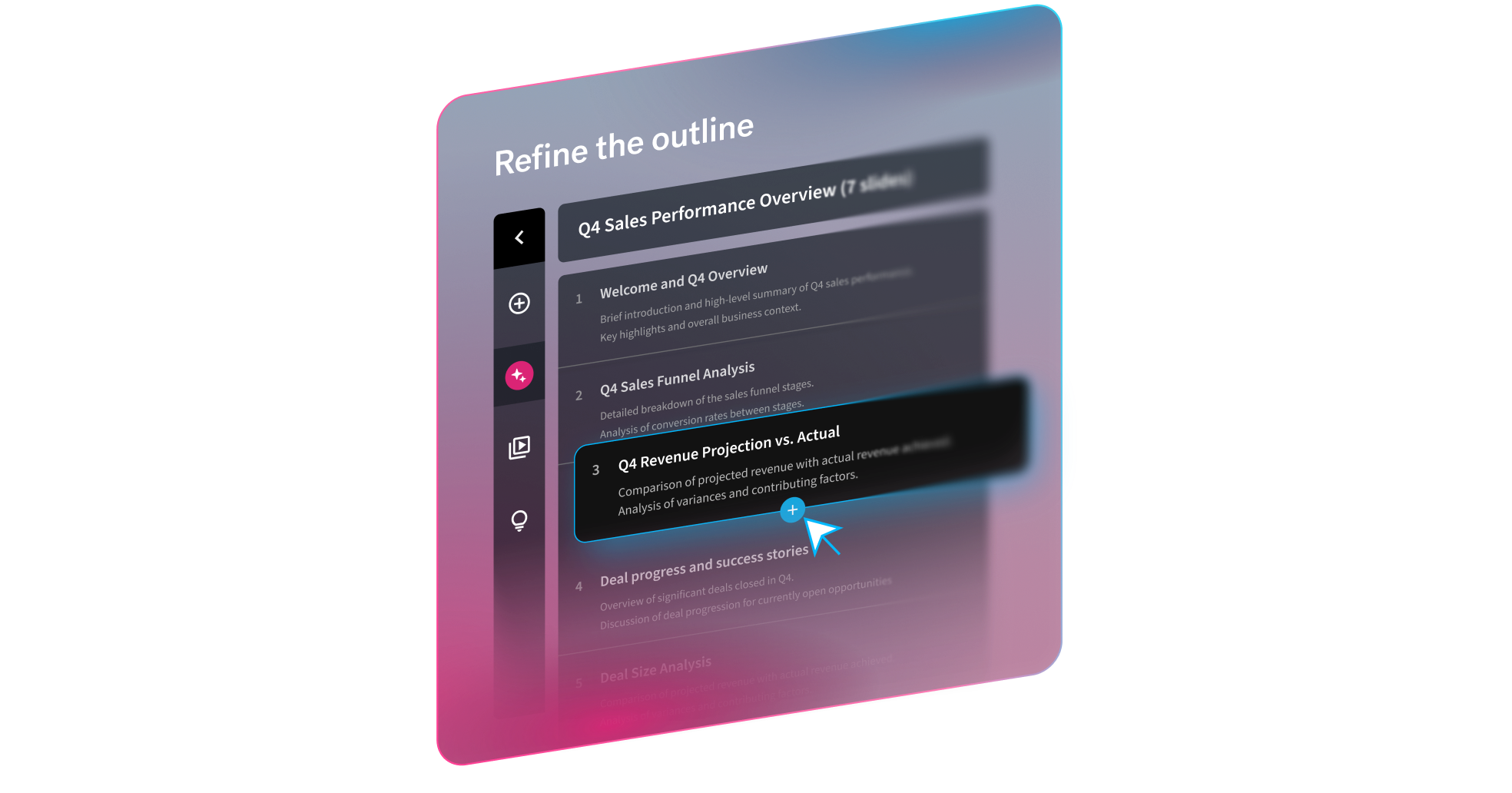 Discover AI that creates what you asked for. Our new AI presentation workflow is smarter, faster, and more flexible. Get to work-ready slides, 10x faster.