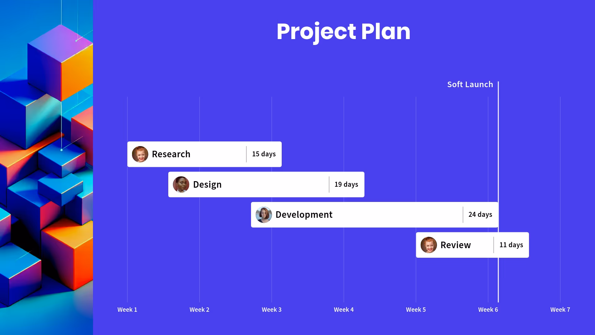 For a more engaging design, you can opt for a sidebar on either side of your Gantt chart. The sidebar is fully customizable, and can house video, image(s), text, or a combination of all three. By adding a sidebar with a supporting visual, you’re encouraging your audience to focus on the slide and retain the information within your chart.