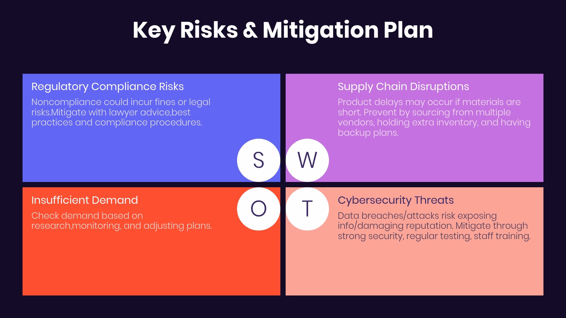 Keep color and font easy to read. A SWOT analysis slide template using pale colors or decorative font might get lost. Remember that there are four categories to display so font size isn’t as large as single category slides.