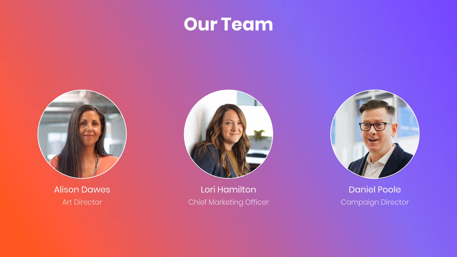 The team slide was created to visually represent key members of your team. It can include photos, names, job titles, and even information about your team’s credentials or past experience. An effective team slide makes it simple for your audience to easily connect everyone with their role or involvement in a company, event, or project.
