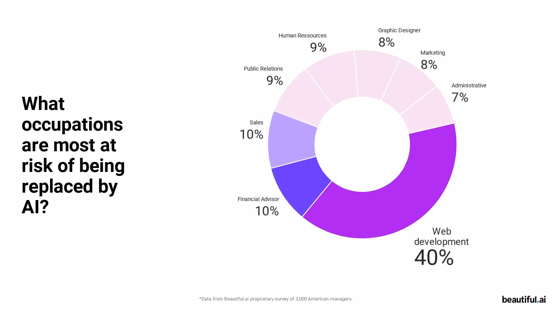 According to those surveyed, 40% believe that web development and computer programming are the most at risk of being replaced by AI, followed by sales, financial advisors or analysts, human resources, public relations or communications, administrative roles, graphic designers, and marketing. Of those managers, nearly 70% agree that it would be financially beneficial for their business if they were able to replace a large number of employees with AI tools.