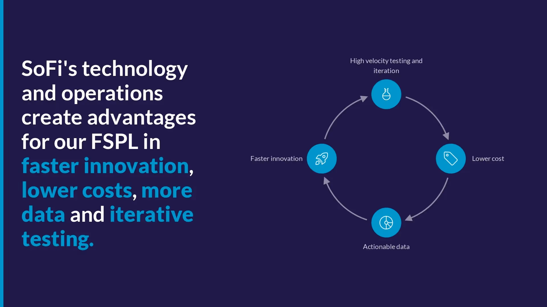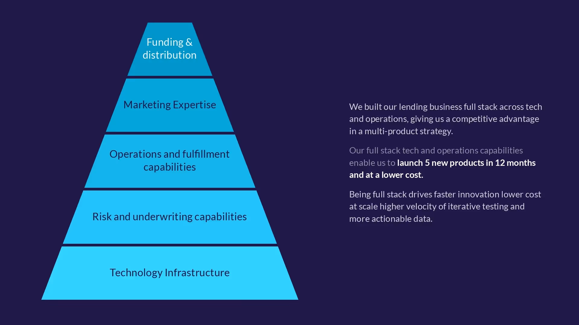 The next two slides outlined their technology and operations: what their process is and why it’s working. Again, SoFi combined various charts and a lot of text on one single slide making it hard for an audience to retain any information. We used both a pyramid and cycle diagram to visualize their content in a better way.