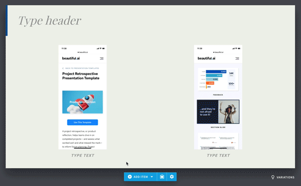 - Inspiration gallery - Choose from hundreds of beautiful, pre-built slides to add to your presentation. Since these slides were created with our smart templates, you can easily customize them with your own content. Click "Add slide" > "Get Inspiration" to peruse the gallery.