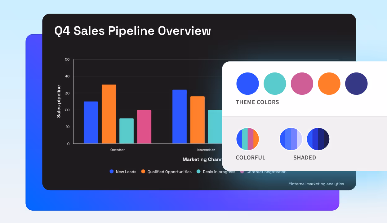 Define your brand colors, fonts, and logos once and the slides will adapt automatically. Shared themes keep every deck consistent and polished.
